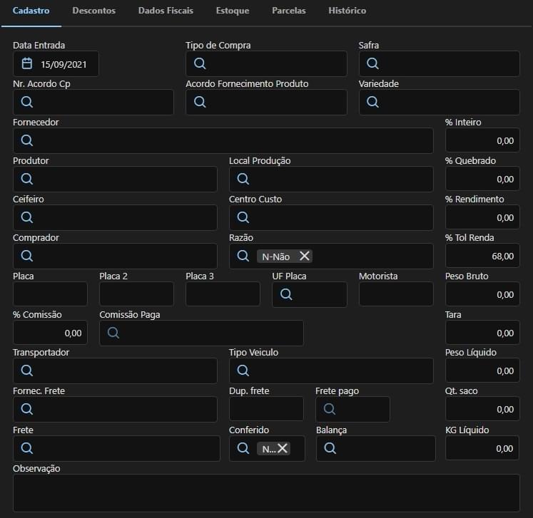 Placa 2: Placa do segundo veículo de transporte de grãos para a compra selecionada. Placa 3: Placa do terceiro veículo de transporte de grãos para a compra selecionada. UF Placa: Placa da transportadora para a compra selecionada. Motorista: Descrição livre para informar o nome do motorista da carga para a compra selecionada. Peso Bruto: Peso total do veículo na chegada à empresa para a compra selecionada.