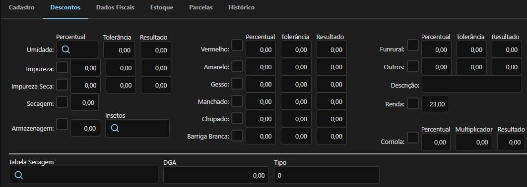 Os descontos podem ser: Impureza Seca, Secagem, Armazena, Vermelho, Amarelo, Gesso, Manchado,