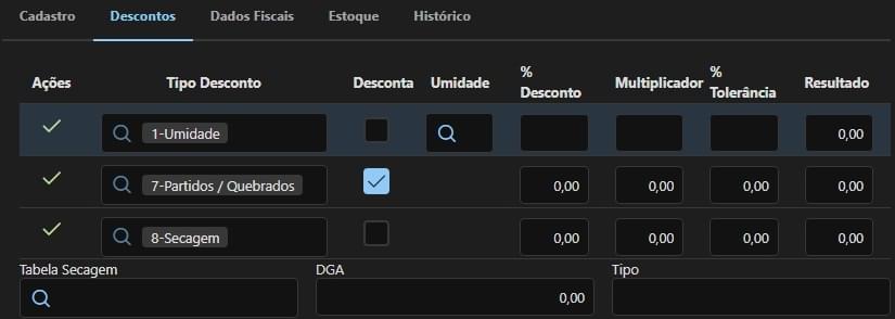 dados de desconto. As informações são disponibilizadas em uma lista que contém as seguintes colunas: Ações: Ação de salvar o registro selecionado. Tipo Desconto: Coluna informativa do tipo de desconto selecionado. Desconta: Marque nesta coluna o(s) item(ns) para considerá-lo(s) nos descontos. Umidade: Tabela de umidade para o desconto selecionado. % Desconto: Percentual de desconto do desconto selecionado. Multiplicador: Multiplicador do desconto selecionado. % Tolerância: Percentual de tolerância do desconto selecionado. Resultado: Resultado final do desconto selecionado.