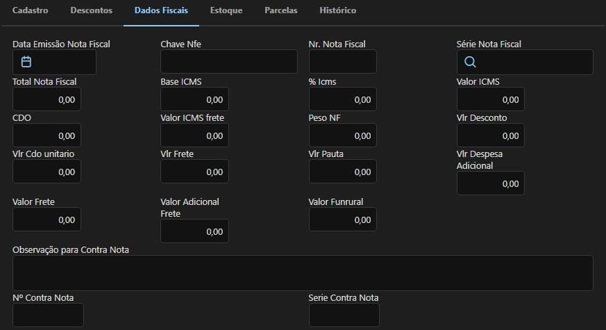 Total Nota Fiscal: Valor total da nota fiscal de entrada dos grãos para a compra selecionada. Base ICMS: Valor da base de cálculo de ICMS da nota fiscal de entrada dos grãos para a compra selecionada. % Icms: Percentual de ICMS da nota fiscal de entrada dos grãos para a compra selecionada. Valor ICMS: Valor de ICMS da nota fiscal de entrada dos grãos para a compra selecionada. CDO: Valor da taxa de Cooperação e Defesa da Orizicultura (CDO) da nota fiscal de entrada dos grãos para a compra selecionada. Valor ICMS Frete: Valor total do ICMS do frete da nota fiscal de entrada dos grãos para a compra selecionada. Peso NF: Peso total informado na nota fiscal de entrada dos grãos para a compra selecionada. Valor Desconto: Valor total de desconto da nota fiscal de entrada dos grãos para a compra selecionada. Valor CDO Unitário: Valor unitário da taxa de Cooperação e Defesa da Orizicultura (CDO). Valor Frete: Valor do frete por tonelada da nota fiscal de entrada dos grãos para a compra selecionada. Valor Pauta: Valor de pauta da nota fiscal de entrada dos grãos para a compra selecionada. Valor Despesa Adicional: Despesas adicionais da nota fiscal de entrada dos grãos para a compra selecionada. Valor Frete: Valor do frete da nota fiscal de entrada dos grãos para a compra selecionada. Valor Adicional Frete: Valor do adicional de frete da nota fiscal de entrada dos grãos para a compra selecionada. Valor Funrural: Valor de Funrural da nota fiscal de entrada dos grãos para a compra selecionada. Observação Contra Nota: Observações gerais para serem informadas na observação da nota fiscal ao gerar a contra nota. Nº Contra Nota: Campo informativo do número da nota fiscal gerada pela contra nota. Serie Contra Nota: Campo informativo da série da nota fiscal gerada pela contra nota.