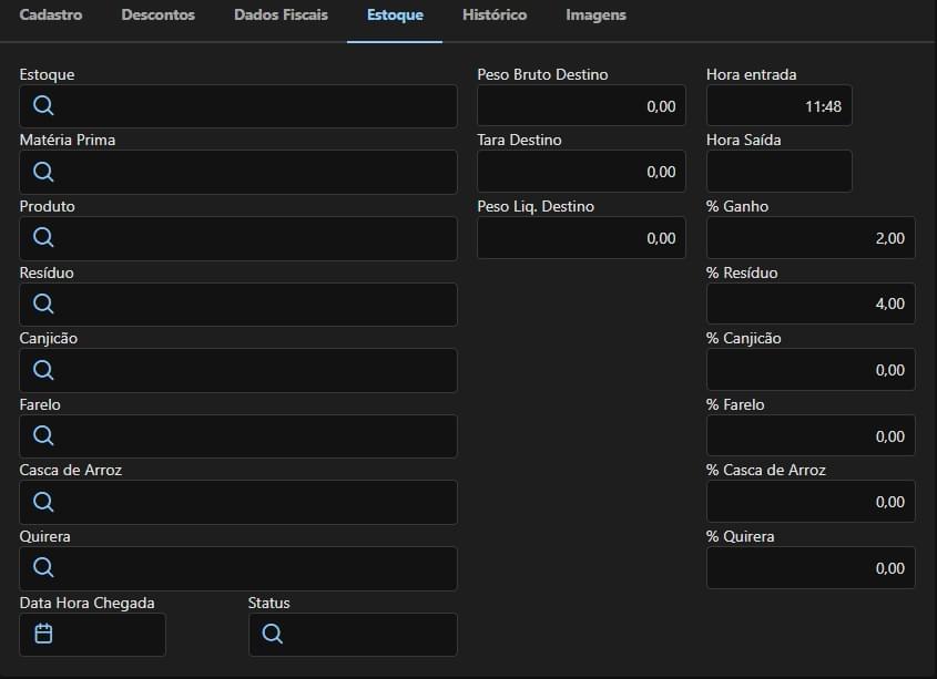 Peso Bruto Destino: Peso bruto de destino. Hora Entrada: Hora de entrada. É sugerida a hora no momento de criar a entrada. Matéria Prima: Matéria-prima que receberá o estoque.
