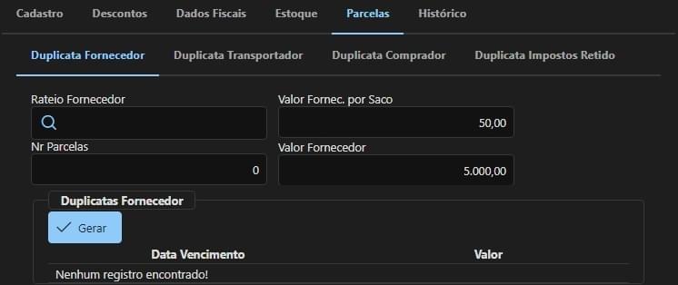 Nesta parte são mostradas as informações de duplicatas a pagar para os produtores, normalmente geradas pela contra nota, se a compra possuir