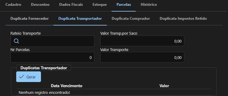 Nesta parte são mostradas as informações de duplicatas a pagar para os transportadores se a compra possuir no tipo de compra, aba "Cadastro",