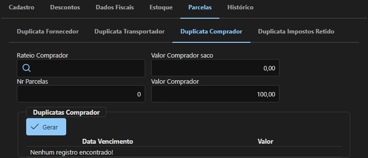 Nesta parte são mostradas as informações de duplicatas a pagar para os compradores se a compra possuir no tipo de compra, aba "Cadastro",