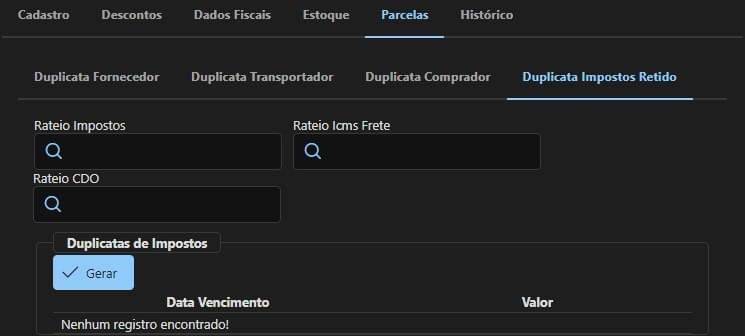 Nesta parte são mostradas as informações de duplicatas a pagar de impostos retidos de ICMS e CDO se a compra possuir no tipo de compra,