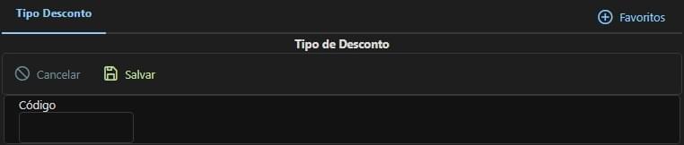 Cancelar: Cancelar a alteração ou criação do tipo de desconto selecionado. Excluir: Excluir o tipo de desconto selecionado. Este botão é habilitado somente ao editar um registro existente. Salvar: Salvar o tipo de desconto selecionado. Código: Campo informativo do código do tipo de desconto selecionado.