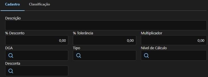 Aba Cadastro: Descrição: Descrição do tipo de desconto selecionado. % Desconto: Percentual de desconto para o tipo de desconto selecionado.