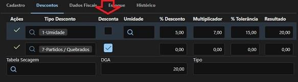 secagem. No Cadastro de Compra, aba "Descontos", é