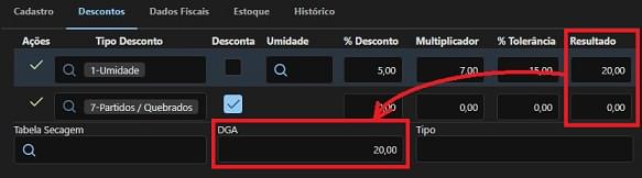 DGA: Seleção que informa se deve ou não considerar o desconto no DGA (Defeitos Gerais Agregados) para o tipo de desconto selecionado.