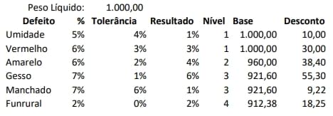 O percentual de desconto é o percentual do defeito ocorrido no grão. Por exemplo, dizer que 5% dos grãos recebidos na empresa para determinada