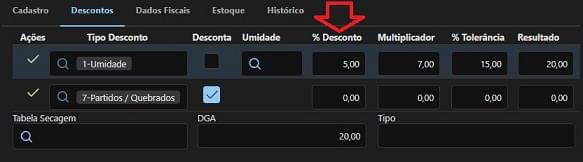 habilitado o campo na coluna Umidade para informar uma umidade da tabela de umidade. O - Outros: Utilize este tipo para quaisquer outros descontos.