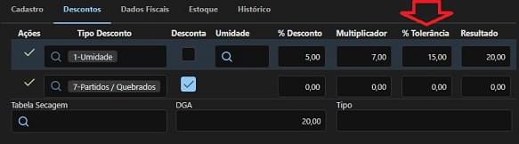 desconto. Desta forma, normalmente não deve ser informado para este item uma tolerância, pois o percentual de secagem será descontado