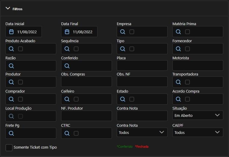 Agrupador Filtros: Data Inicial: Data inicial da geração das compras a considerar na lista de compras. Data Final: Data final da geração das compras a considerar na lista de compras. Empresa: Empresa(s) a considerar ou desconsiderar na lista de compras. Matéria-Prima: Matéria(s)-prima(s) a considerar ou desconsiderar na lista de compras. Produto Acabado: Produto(s) acabado(s) a considerar ou desconsiderar na lista de compras. Sequência: Sequência(s) (ticket/número da compra) a considerar ou desconsiderar na lista de compras. Tipo: Tipo(s) de compras a considerar ou desconsiderar na lista de compras. Fornecedor: Fornecedor(es) a considerar ou desconsiderar na lista de compras. Razão: Razão a considerar na lista de compras. Conferido: Tipo de compras conferidas a considerar na lista de compras. Placa: Placa do veículo registrado na compra a considerar na lista de compras. Motorista: Motorista do veículo registrado na compra a considerar na lista de compras. Produtor: Produtor(es) a considerar ou desconsiderar na lista de compras. Obs. Compras: Observação de compra a considerar na lista de compras. Obs. NF: Observação de nota fiscal a considerar na lista de compras. Transportadora: Transportadora(s) a considerar ou desconsiderar na lista de compras. Comprador: Comprador(es) a considerar ou desconsiderar na lista de compras. Ceifeiro: Ceifeiro(s) a considerar ou desconsiderar na lista de compras. Estado: Estado(s) a considerar ou desconsiderar na lista de compras. Acordo Compra: Acordo(s) de compra a considerar ou desconsiderar na lista de compras. Local Produção: Local(is) de produção a considerar ou desconsiderar na lista de compras. NF. Produtor: Nota Fiscal do produtor a considerar na lista de compras. Contra Nota: Contra Nota a considerar na lista de compras. Situação: Situação atual a considerar na lista de compras. Frete Pg: Frete pago ou não a considerar na lista de compras. CTRC: CTRC(s) vinculados a considerar ou desconsiderar na lista de compras. Contra Nota: Considerar compras com ou sem contra nota na lista de compras. CAEPF: Considerar compras com ou sem CAEPF na lista de compras. Somente Ticket com Tipo: Campo que, se marcado, irá considerar apenas entradas com tipo de compras informado, na lista de