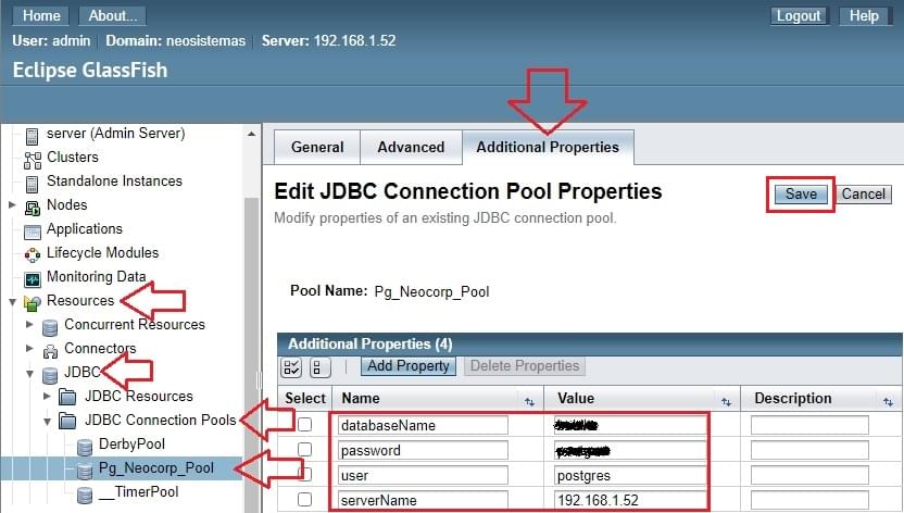 Clique em "Resources", depois em "JDBC", depois em "JDBC Connection Pools", depois em "Pg_Neocorp_Pool" e depois selecione a aba "Additional