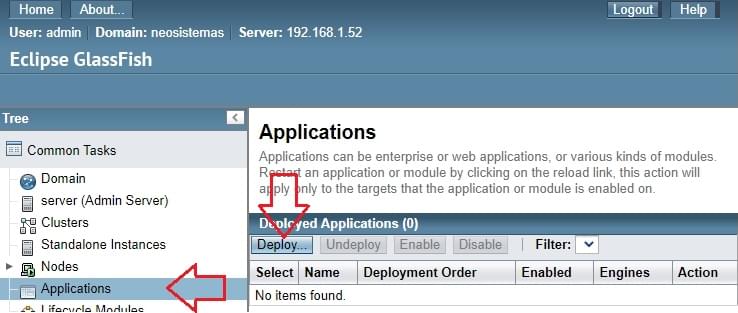 https://localhost:4848, informe o login e a senha e acesse o menu "Applications" e "Deploy".