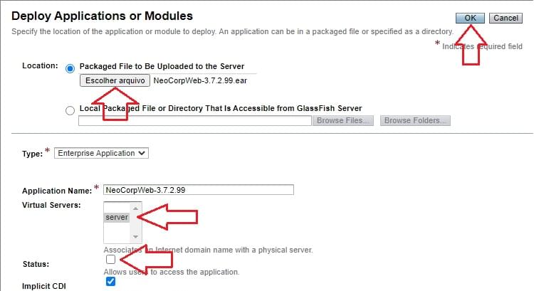 Clique em "Escolher arquivo" e selecione o arquivo "NeoCorpWeb-X.X.X.XX.ear" da pasta "glassfish6". Na opção "Virtual Servers" clique em "server",