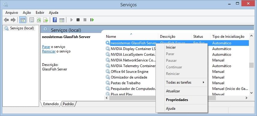 Selecione o serviço digitando "neosistemas", clique com o botão direito do mouse em cima do serviço e selecione a opção "iniciar".