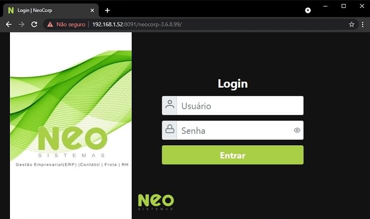 admin, em "Password" informe a senha (senha disponível com o suporte NeoCorp) e clique em "Login".