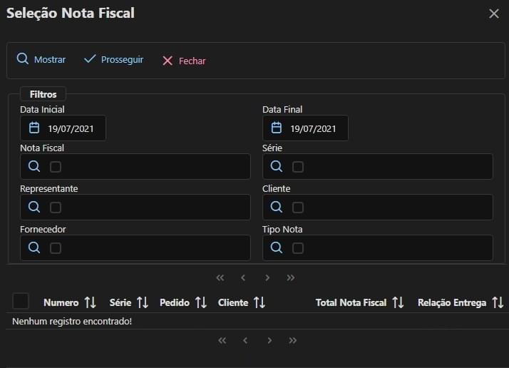 Mostrar para mostrar as notas fiscais conforme os campos acima informados em uma lista com as seguintes colunas: